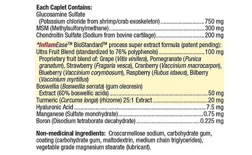 - Chứa glucosamine và chondroitin sulfate cũng như methylsufonylmethane (MSM), mangan, boron và axit hyaluronic, chế phẩm này cung cấp các khối xây dựng của mô khớp khỏe mạnh. Các chất dinh dưỡng này cũng ngăn ngừa sự phân hủy sụn do thoái hóa khớp, giúp giảm viêm khớp cũng như các cơn đau và khó chịu liên quan đến viêm xương khớp.